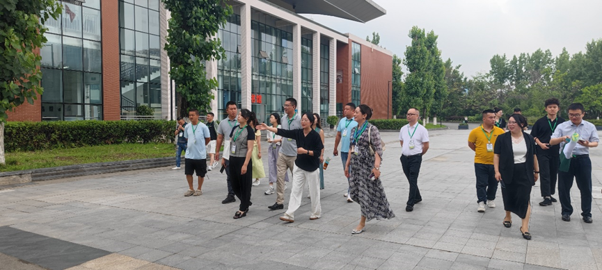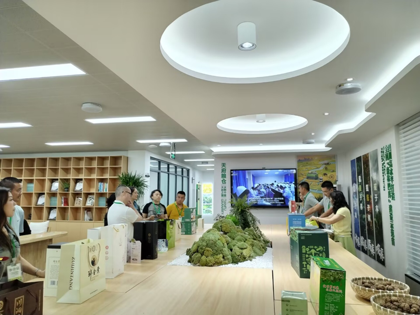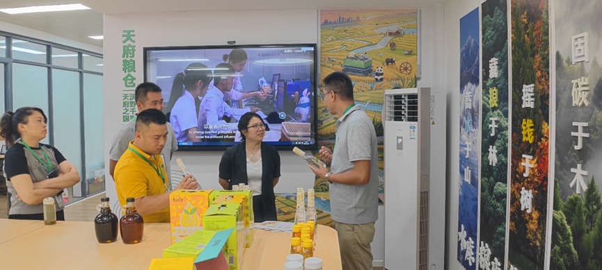 活动中,学校机关党委副书记赵映菊接待了与会嘉宾并带领其参观学校成都校区,系统地介绍了学校基本情况、党建经验及产教融合成效。随后,与会嘉宾又一同参观了由学校联合成都市品牌农业促进会共同打造的乡村振兴产教融合基地,基地建筑面积达1200㎡,是学校深化产教融合、服务地方农业品牌建设的重要实践平台,同时也是学校践行服务社会使命、推动乡村振兴战略落地的关键载体。据相关负责人介绍,基地集“品牌孵化、资源对接、人才培养、产品交易”于一体,设有品牌农产品展区、商务交流区、共享会议室、直播间、品牌孵化区等功能分区,依托学校资源与优势,整合多方力量搭建农业品牌孵化平台,聚焦行业引领、农业人才培养、农业品牌孵化、农业产品交易促进等核心内容,致力于赋能成都农业品牌实现高质量发展。