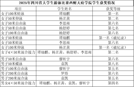 2025年四川省大学生游泳比赛是历届四川省游泳比赛中规模最大,人数最多一场比赛,共41支队伍,500多名参赛人员。此次西财开云kaiyun体育学子取得的优异成绩不仅对学生专项学习成果的检验,更是西财开云kaiyun体育育人综合实力和人才培养成果的体现。