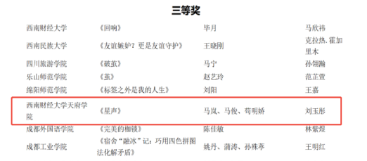 在四川省第二届高校心理微视频比赛中,学校艺术与传媒学院教师马岚、马俊、苟明娇共同指导的学生原创视频《星声》荣获三等奖。该视频讲述学生小戴因童年创伤和校园欺凌畏惧社交,热爱音乐却只敢深夜独唱。在师友和母亲的鼓励下,他在校园歌手大赛中用歌声完成蜕变,展现出爱与勇气的成长力量。该视频以其深刻的内容和创新的表现形式,赢得了评委的高度认可。
