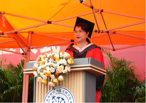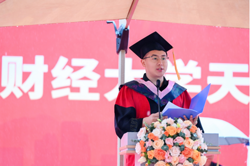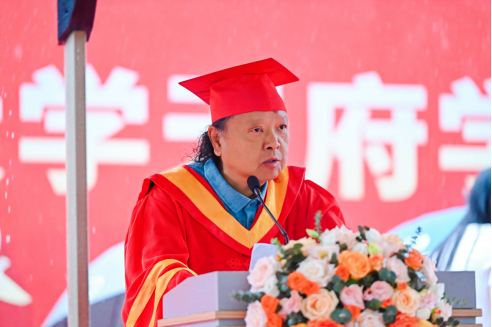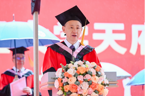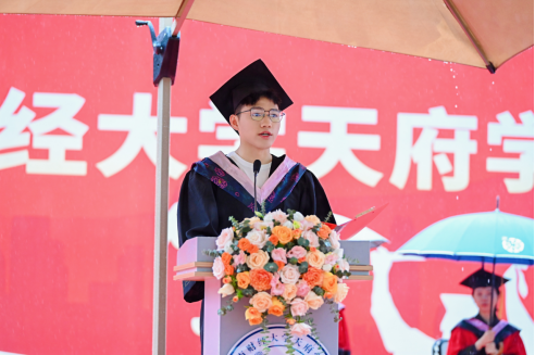 嘹亮的国歌穿透雨幕,全体师生肃然而立,毕业典礼就此开场。蒲果泉在致辞中首先向圆满完成学业的毕业生们致以最热烈的祝贺,向辛勤培育学子的父母和谆谆教诲的师长们表达了崇高的敬意与诚挚的谢意。他动情地表示:“昔日的你们怀揣理想走进天府校园,如今虽告别大学时光,但充满梦想和希望的青春舞台永不落幕。”毕业不是终点,是追梦的新起点,离别之际,他向毕业生们提出三点殷切期望:一要永葆初心,做勇毅前行的时代追梦人;二要求真务实,做开拓创新的实践者;三要与时俱进,做引领发展的先锋力量。
