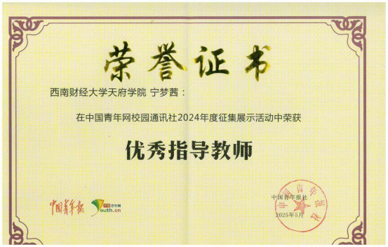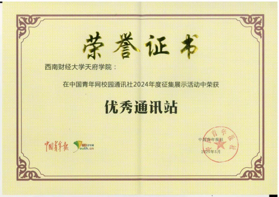 近日,中国青年网公布“中国青年网校园通讯社2024年度评选活动”结果。经作品初审、网络评选、打分复审及年度考核等严格环节,全国120所高校获评“优秀通讯站”,119名教师荣获“优秀指导老师”称号,149名学生获评“优秀通讯员”,另有60篇原创稿件及其作者获表彰。西财开云kaiyun体育在此次评选中表现优异,一举斩获三项荣誉:学校获评“优秀通讯站”称号,党委工作部教师宁梦茜荣获“优秀指导教师”称号,校新闻宣传中心陈星妍同学荣获“优秀通讯员”称号。这一成绩充分彰显了学校在校园新闻宣传、青年思想引领和网络文化建设方面的扎实工作和突出成效。