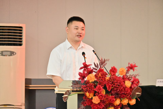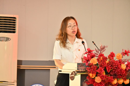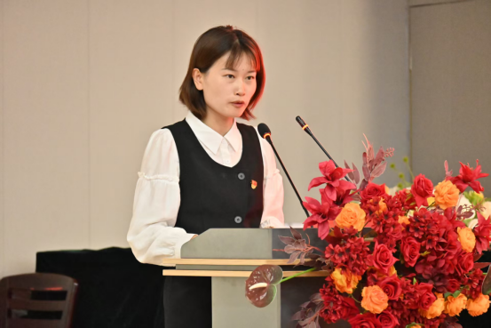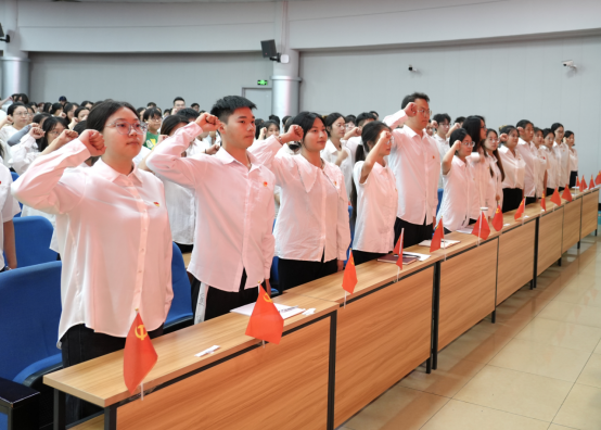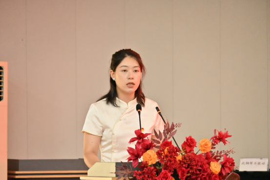 袁勋带领新党员庄严宣誓,全体老党员一同重温入党誓词。在鲜红党旗的见证下,掷地有声的誓言响彻会场,彰显着党员们对党的赤诚之心。随后新党员代表陈可发言,她满怀感恩地表示:“在心中埋下的红色种子终于破土而出,每一个环节都凝结着党组织的关怀与培养。”结合自身经历,她讲述分享了成长路上的深刻感悟,表态未来必将坚定理想信念,勤奋学习勇于创新,以“请党放心,强国有我”的担当让青春绽放光彩。