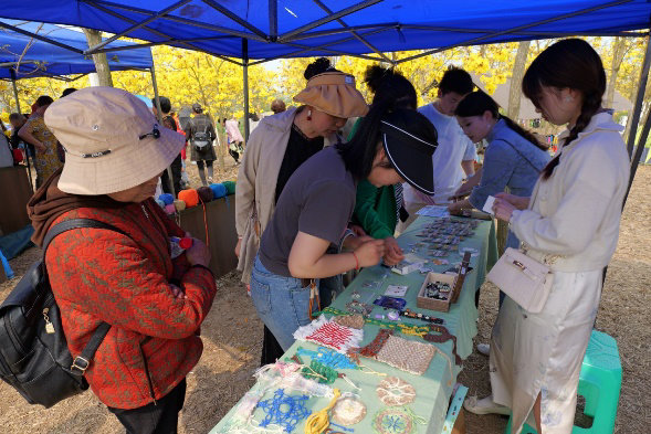 舞蹈、歌曲等节目轮番上演,展现出学生们的才华和激情。现场还展出了学生们的创意绘画、手工艺品等艺术作品,不仅展现了学生们的专业技艺,也让村民们在家门口感受到了艺术的趣味和魅力。前来参观打卡的村民络绎不绝,他们纷纷参与漆画扇面绘制、环保材料编织体验等活动。