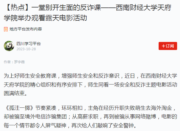 “人有两颗心,一颗是贪心,一颗是不甘心”这句话贯穿了这部电影。此电影取材自上万起真实诈骗案例,是一部深刻揭露境外诈骗全产业链骇人内幕的影片。通过电影,学校师生们身临其境地感受境外电信网络诈骗团伙的工作、生存环境,以及“高薪资”骗局背后的秘密。