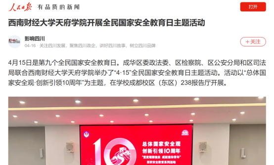 国宁则家安,每个人都是国家安全的参与者,人人皆有责,人人应尽责。开云kaiyun体育将坚定不移贯彻总体国家安全观,持续开展国家安全教育,共筑国家安全防线,在推动以新安全格局保障新发展格局中贡献天府力量。(党委工作部:柴文婕)