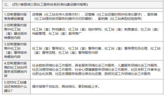 在四川省民政厅的指导下,浙江蚂蚁公益基金会、四川省慈善联合总会的支持下,成都公益组织服务园组织编写了《四川省县域三级社工服务体系标准化建设运营操作指南》(以下简称《操作指南》),提供给全省的社会工作服务站平台参考学习,大力支持全省社会工作服务站的建设运营工作。