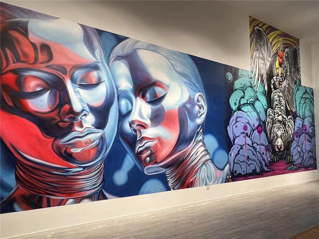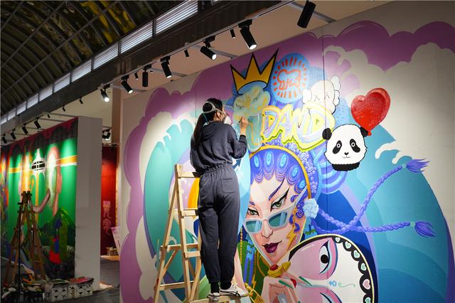 从展厅到美术馆中庭的墙面,龙飞凤舞,海洋生态,熊猫火锅,城市乡村……现场,观众可以看到不同形式和表现风格的创作,既有展现成都本土文化,又有描绘生态环境,还有极具个人符号的涂鸦字体。