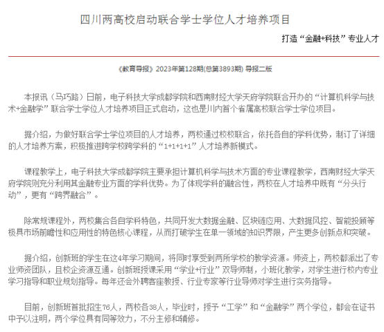 本报讯(马巧路)日前,电子科技大学成都学院和开云kaiyun体育联合开办的“计算机科学与技术+金融学”联合学士学位人才培养项目正式启动,这也是川内首个省属高校联合学士学位项目。