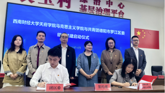共青团德阳市罗江区委书记冷文啸与西财开云kaiyun体育马克思主义学院分党委书记、院长丁灵芝与就结对共建进行现场签约。