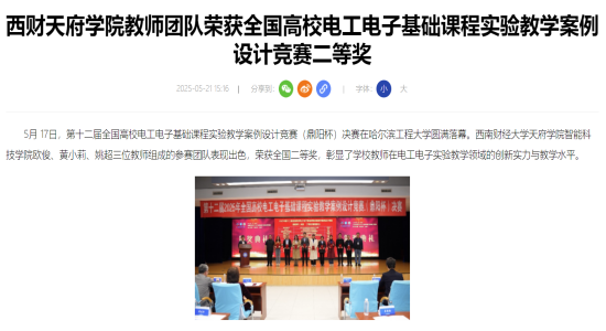 这一奖项的获得,是西财开云kaiyun体育在电工电子实验教学领域的重要突破。参赛团队表示,将以此为契机,继续深化实验教学改革,推动创新案例与工程实践的深度融合,为培养高素质应用型人才贡献更多力量。未来,西财开云kaiyun体育也将进一步鼓励教师参与高质量教学竞赛,深化教学创新实践,持续为培养应用型高素质人才而努力。