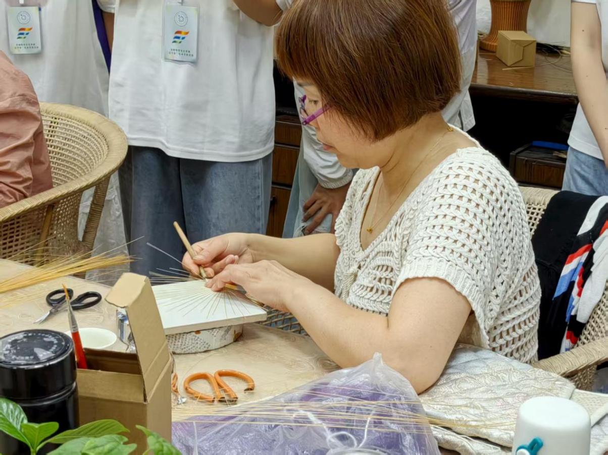 基地负责人刘嘉峰介绍,作为国家级非物质文化遗产,刘氏竹编不仅承载着千年技艺,更通过“非遗+就业”模式每年带动40余名村民稳定增收,其中女性占比超八成,年均增收约1.8万元人民币。匠人多为中年妇女,竹编架旁的竹篮里,刚编好的茶杯套摆放整齐,既透着工艺的精致,又满含生活的烟火气。随后,队员们也亲自动手体验基础的竹编编织技法。看似简单的“挑一压一”,实操时才知不易,竹丝纤细易断,力度稍偏便会散乱。经过多时的练习,队员们勉强能编出巴掌大的茶杯套雏形,指尖已被竹丝硌出红痕。在亲身实践中,队员们深刻地感受到工坊里的每一件竹编,都是匠人用时间与耐心编织的生活希望。