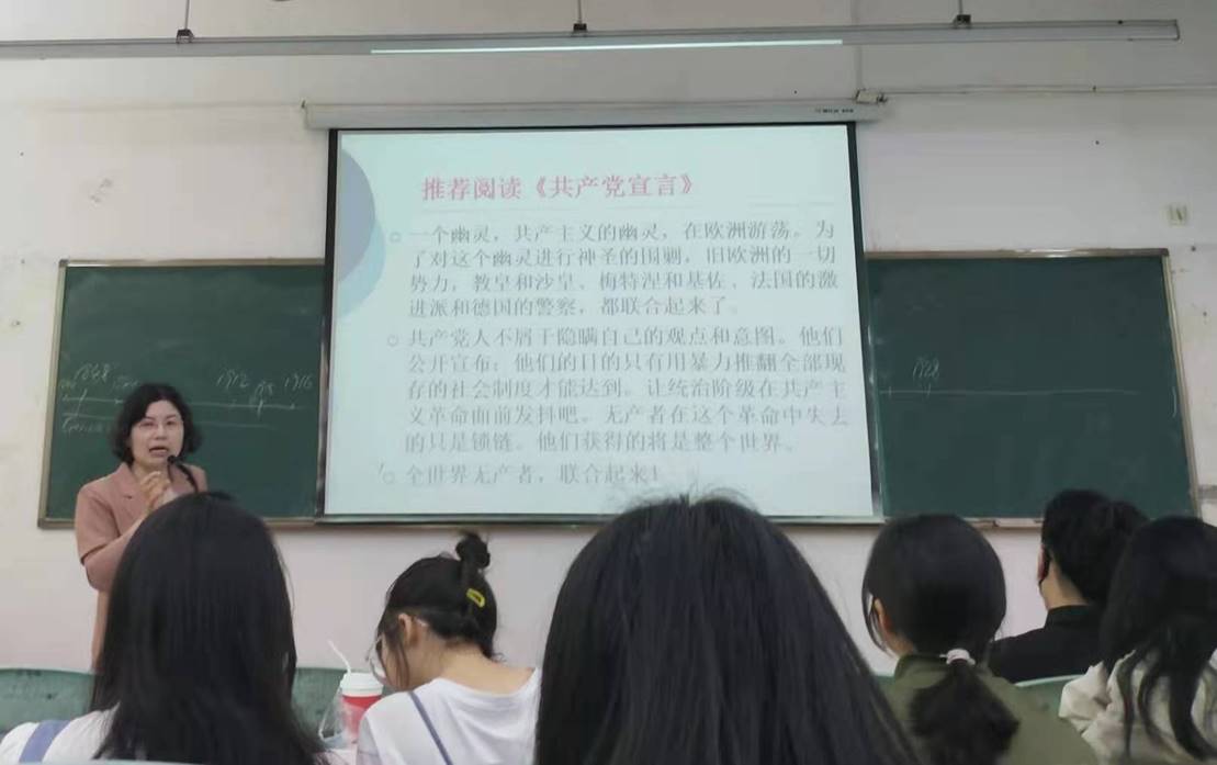 经典文献进课堂。邓海霞在课堂教学的过程中,根据教学内容,适时穿插经典文献,如讲解马克思主义传入中国的时候,带领大家朗读《共产党宣言》片段,导学文献主要精神,加深对马克思主义的理解。讲解五四运动、党的成立、红军长征、抗日战争的时候,把习近平系列重要讲话精神融入课堂教学,加深理解红色精神的时代价值。讲解革命新道路的时候,有机融入毛泽东诗词以及毛泽东选集的经典文章,深刻理解毛泽东思想活的灵魂,感受毛泽东的伟大。