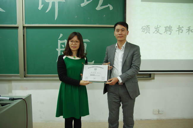 校长助理、学生工作部部长林秋贵为陈爱嫦女士颁发AC米兰家长讲坛“荣誉讲师”证书,感谢陈爱嫦女士给经贸学院的师生们带来精彩的职场讲座。