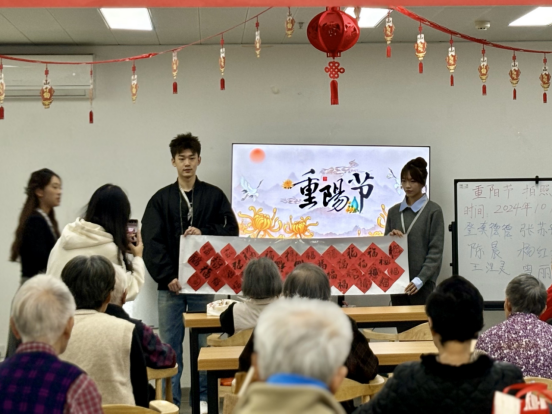 为弘扬中华民族尊老、敬老、助老、爱老的传统美德,重温节日习俗,赓续传统文化。2024年重阳节之际,艺术与传媒学院党建服务中心组织开展“九月九重阳享佳节,青老互助送温暖”重阳节主题活动。活动组织学院学生为成都成华天府众合老年护理中心的老人“写福字”,进一步营造关爱老年人的浓厚氛围,提升积极参与关爱老人的志愿服务意识,增进同学们与老年人的沟通,让中华民族尊老敬老传统美德赓续传承。