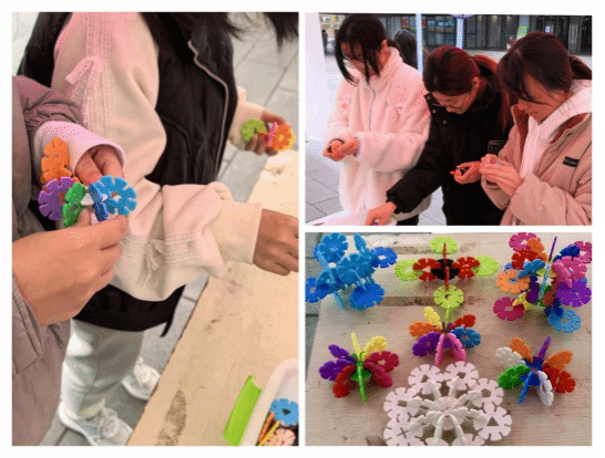 此外,同学们还用曾经给予他们无数欢乐与梦想的雪花片来拼搭各种创意造型,表达对童年美好时光的怀念。雪花片如同一把钥匙,打开了同学们对美好生活无限向往的大门,寄托着他们对未来生活的美好憧憬与热切期待。