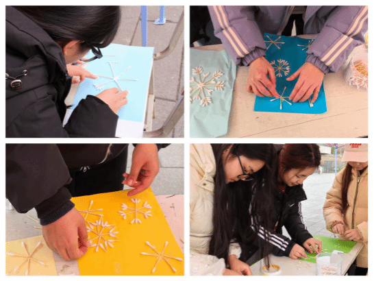 同学们纷纷动手,发挥创意,用棉花棒拼出了各式各样的雪花图案。每一根细小的棉花棒都被巧妙地运用,模拟出雪花那错落有致、晶莹剔透的六边形分支,它们或繁复交织,或简约雅致,无不展现出同学们的心灵手巧。
