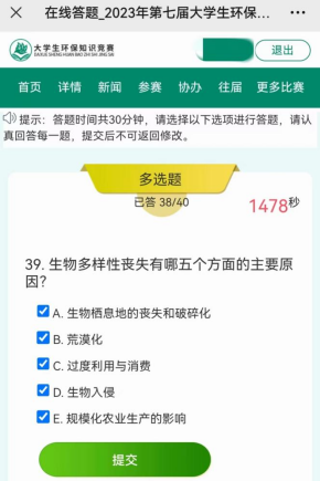 本次活动线上开展,通过问卷星小程序进行线上环保知识学习及竞答,涵盖环境保护各方面,包括生物多样性保护、生态建设、垃圾分类、空气污染的相关问题及如何践行环保理念等内容。此次活动形式简单但极具意义,同学们进一步了解到环境保护的相关知识,学习保护环境的措施。同学们积极参与知识竞答,提升环保意识,并将其应用于实际生活,践行环保的真谛,最终打造一个绿色、和谐的校园环境。