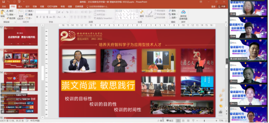 为贯彻落实教育部《关于在疫情防控期间做好普通高等学校在线教学组织与管理工作的指导意见》,实现停课不停教,停课不停学。2022年9月5日,智能科技学院在腾讯网络研讨会上开启2022级新生开学第一课,学院院长徐鸿雁、党总支书记常荣、副书记陈礼花、副院长陈婷、陈小宁担任出席嘉宾,学工综合办副主任李禹锌主持,六百五十余名新生准时进入课堂。
