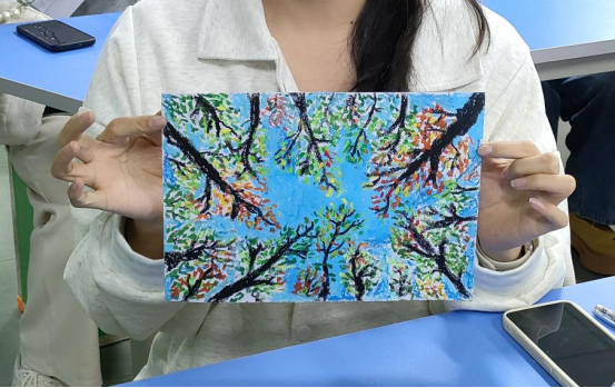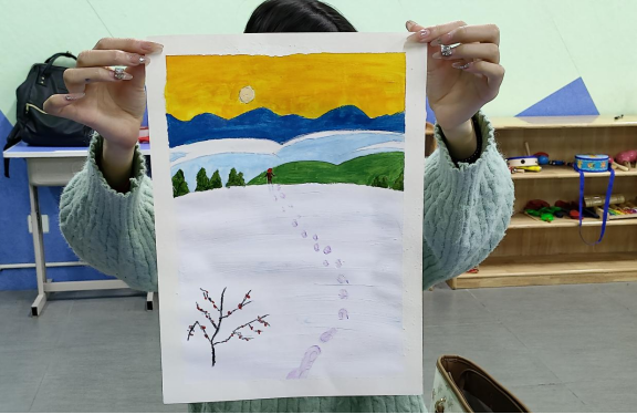 活动伊始,主持人致开幕词,阐述了艺术与文化在学院教育中的重要性,期望通过本次活动,点燃同学们心中的创意火花,放飞想象的翅膀,推动艺术素养的全面提升。随后,同学们满怀激情地握起画笔,在画布上自由挥洒创意与灵感,将心中的美好愿景跃然纸上。如,文化与教育学院学生赖杨,以独特的抬头仰视视角,生动描绘了她想象中冬日树木的勃勃生机;肖瑶同学,则运用丰富的油彩,细腻地勾勒出了她眼中的大学校园在皑皑白雪覆盖下的静谧冬日。整个创作现场洋溢着热烈而和谐的艺术氛围,同学们沉浸其中,乐此不疲。经过一个多小时的精心创作,一幅幅独具匠心的佳作逐一亮相,这些作品不仅充分展示了同学们的艺术才华,更体现了他们对生活的无限热爱和对美的追求。同学们纷纷登台,满怀激情地向大家分享了自己的创作理念与背后的故事,让在场的同学们感受到了艺术的魅力和生活的多彩。