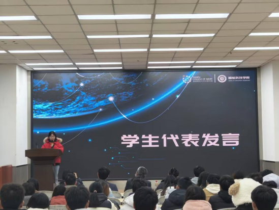 随后,物联网专业学生米琦作为创新班学生代表发言。她表示,作为首批进入创新班的学生,自己深感荣幸。自己将珍惜这个难得的机会、努力学习,不断提升自己的综合能力。同时,她也希望与同学们一起探索人工智能的奥秘,共同为学院的人工智能事业贡献自己的力量。