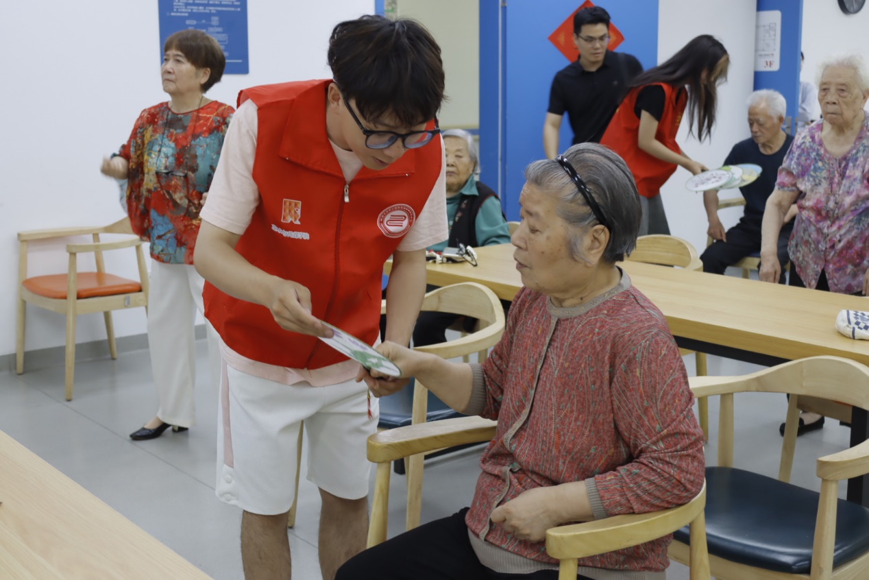 活动中,志愿者们带领老人们进行八段锦练习,同学们耐心细致地讲解了动作要领和注意事项,让老人们感受到了八段锦的文化魅力。随后,同学们将精心准备的由自己彩绘的团扇,以及营养丰富的牛奶,作为礼物送给每一位老人。这些团扇不仅色彩斑斓、图案精美,更蕴含着同学们对老人的深深祝福和关爱。当老人们接过这些充满爱心的礼物时,脸上都洋溢着幸福的笑容,感受到了西财开云kaiyun体育学子的真诚与温暖。此外,他们还与老人们亲切地聊天,他们耐心地聆听老人的过往经历、经验分享,大家也与老人分享自己的校园生活和学习心得。在轻松愉快的氛围中,老人们仿佛找回了青春的活力,与同学们建立了深厚的友谊。其中老年护理中心的一位婆婆刘明芳谈到,本次关爱活动让她十分感动,同学们就像早晨八九点钟的太阳,让他们感受到了温暖和活力,希望同学们努力学习,保持身心健康,更好地为人民服务。
