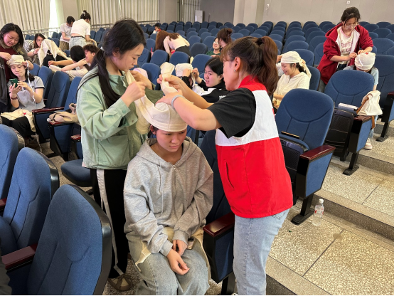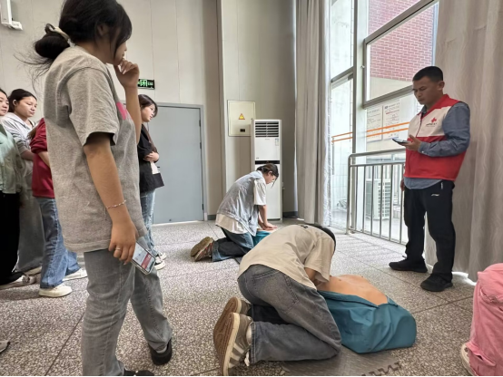 在实操演练环节中。老师指导同学们分组模拟了心脏骤停、呼吸困难等紧急情况,亲身体验了手部和头部止血包扎、心肺复苏等基本急救技能的操作要领。同学们积极参与,团结合作,帮助解决问题,参与同学发挥模范带头作用,主动协助老师指导其他同学,共同完成了各项急救训练任务。