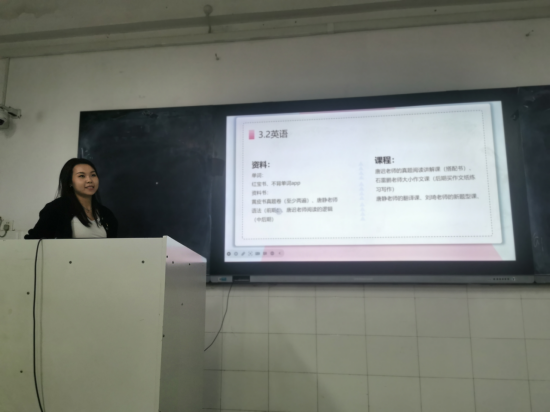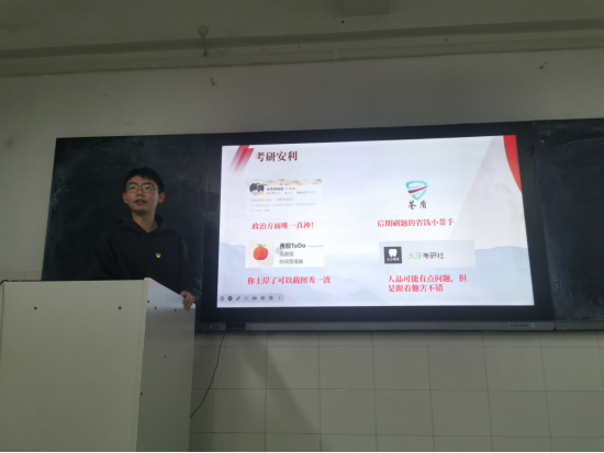 分享会由四位考研成功的学生依次进行分享,他们分别介绍了自己的考研经历,重点介绍了如何高效地选择报考学校,建议可以先选择想去的地区再选择学校。其次对政治、英语及专业学科的学习方法提供了参考,建议可以根据自身实际情况报名线下机构学习或找目标院校的学长学姐进行指导,也可以利用好网络资源进行学习。讲座上他们对学弟学妹进行鼓励,表示如有任何需要后期可以继续给予帮助。