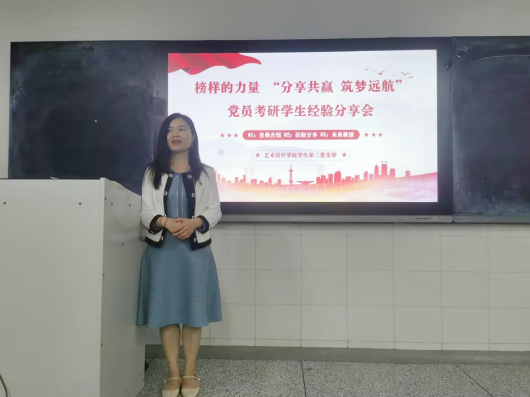 为了助力学院学生深造规划发展,增强学生考研的意志信念,解答学生在考研途中的困惑,让学生能更好应对考研过程中的困难,5月22日晚,学院学生第二党支部于成都校区(东区)201教室召开了“分享共赢,筑梦远航”考研经验分享会。参与本次分享会的老师有学院党总支副书记马俊、学生第二党支部全体辅导员老师、环境设计专业学生党员张耀杰、艺术教育专业学生党员霍娇、产品设计专业学生党员王佩灵以及视觉传达设计专业学生江瀚鸣。四位考研成功的学生为学弟学妹们带来了考研学习经验分享。