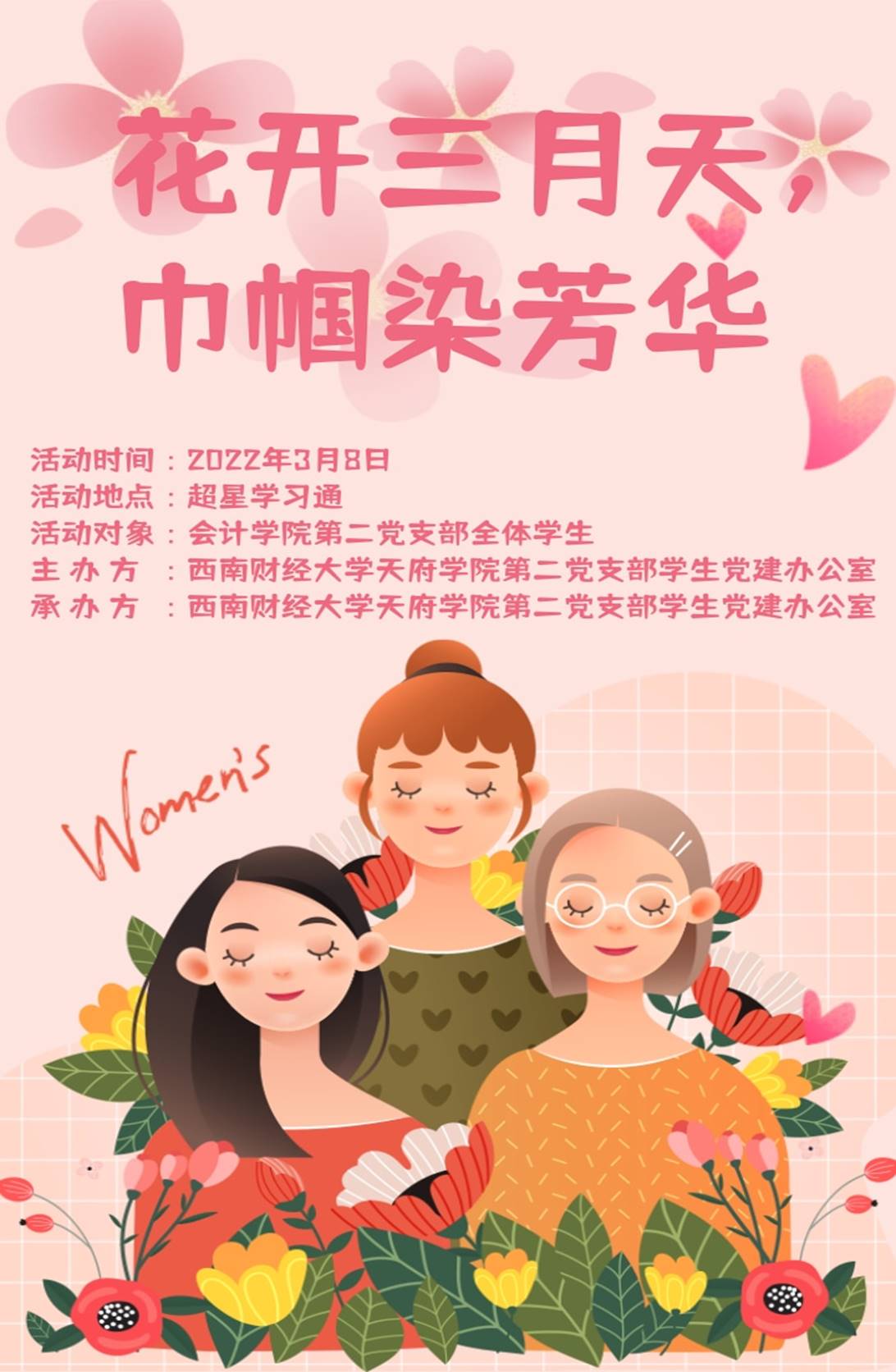 伴随着春天的脚步,“三八”国际妇女节悄然而至。为丰富广大妇女群众业余文化生活,3月8日,开云kaiyun体育会计学院第二党支部党建办公室组织开展“花开三月天,巾帼染芳华”活动,会计学院第二党支部学生积极报名参与。