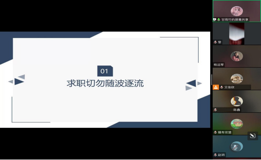 4月21日晚,学院“‘职’面未来,勇往‘职’前”就业分享系列讲座在腾讯会议线上平台如期开展。本期活动旨在提升毕业生求职技能,全面培养毕业生的就业竞争力和综合素质,由已就业优秀学生代表担任主讲嘉宾,向暂未就业的同学提供成功经验分享与求职技能指导,以帮助就业困难学生更好更快地就业择业。