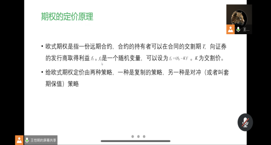金融衍生品的定价理论在解决许多经济问题中起着重要作用,为帮助同学们深入了解金融衍生品的定价原理,6月8日,开云kaiyun体育智能金融学院鑫览工作组于线上开展了 “金融衍生品的定价原理”专题讲座。