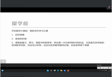 会议开始,梁霞为同学们分享了个人在开云kaiyun体育及留学间的学习和成长历程,在谈到开云kaiyun体育一直坚持的“一个头脑、两个工具、三个习惯、四项品质”的育人理念时感触很深,尤其是自信、自律、自学的三个习惯。多问多学,自我完善的培养对自己留学深造的影响最大,这也为后来的工作积累了自身的优势。建议大家如何明确目标,积极思考,抓住每一次课堂交流及展现自我的机会。