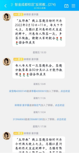 2022年9月5日,智能金融学院于成、绵校区举办“携手同心反邪教,法治护航筑平安”主题活动,通过线上宣讲、线上答题等方式开展,共收集问卷486份,有效参加人数300多人。