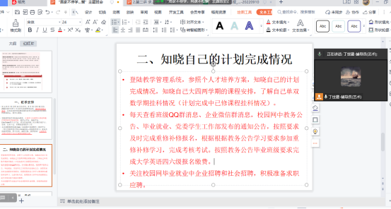 2019级辅导员丁世建向学生强调知晓计划完成情况的重要性,并就实习就业做指导