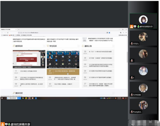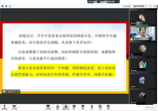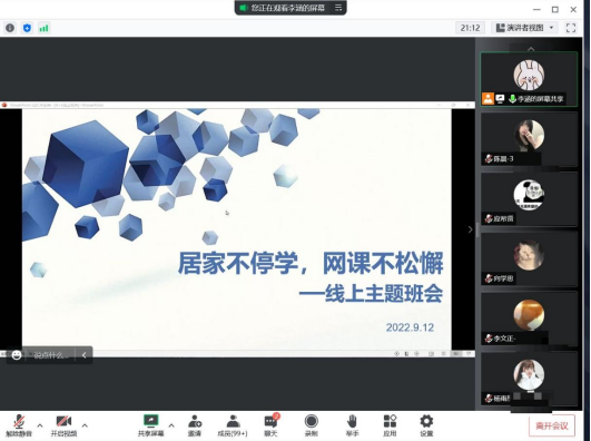 为进一步加强疫情防控教育,激发学院学生以饱满的精神、奋进的姿态投入居家学习和生活中。9月12日晚,艺术设计学院全体辅导员通过“腾讯会议”“企业微信”等新媒体软件,以“居家不停学,网课不松懈”为主题组织各班级开展了线上主题班会,了解同学们的学习情况,鼓励学生在疫情防控下调整好身心状态,上好每一堂云端课。