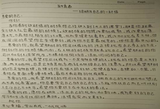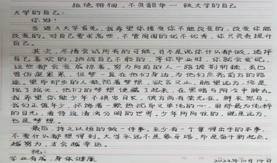 10月14日-10月22日,康养护理学院学生党建办公室面向学院全体在校学生开展了“拒绝徘徊,不负韶华——致大学的自己”书信征集主题活动。