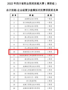 11月12日,由四川省教育厅主办的2022年四川省大学生职业院校大赛圆满落幕。本次比赛包括会计技能、银行业务综合技能、智能财税技能三个赛项。会计学院组织学生参加了会计技能赛项,其中包括财务会计和管理会计分赛项和沙盘模拟分赛项。最终由会计学院周鑫宇、张晓华老师指导的学生匡金平,袁茂婷,朱林,张富林在大赛中获得高职组四川省二等奖。