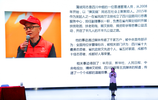 活动伊始,主持人介绍嘉宾蒲斌及其先进事迹。他从2015年至今,组织开展4896次慈善公益活动,帮扶61个乡村和学校,累计发放爱心资金1432.69万元,先后建立81所爱心书屋、捐书2.8万册,一对一资助1040位贫困儿童。蒲斌曾于2021年3月被中央宣传部评为“全国岗位学雷锋标兵”。