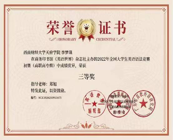 李梦琪获得全国大学生英语语法竞赛三等奖