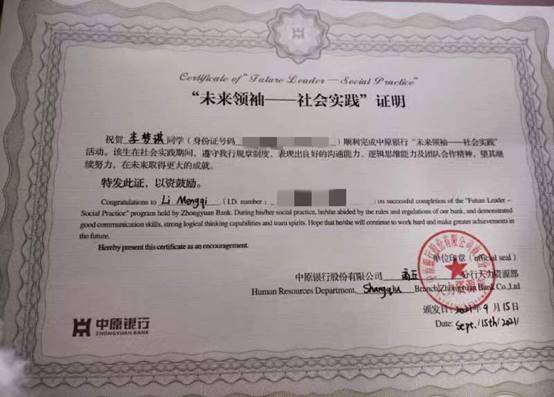 李梦琪在“未来领袖”中原银行实习