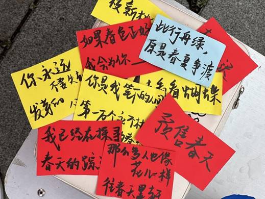 本次活动采取线上线下相结合的方式,线上可通过提交关于春日主题的手绘和视频两种类型的作品参与活动,线下当场创作诗句即可领取鲜花一支。在此次活动中,同学们积极参与,现场创作诗句并制成卡片60余张,线上收到视频作品49份、手绘作品66份。为了换取鲜花,同学们现场写下诗句,例如,“你是我笔下的人间,第一万个永不枯萎的春天,我望进你眸中的波澜层起,跑进了热闹堂皇的人间,跑进了春光里和爱里”“青山潮湿,海棠初醒,听雨打江南春。春色正好,此行舟绿,原是春夏争渡”,无不彰显着春的意蕴。线上提交的手绘和视频作品,也展现着春天的勃勃生机。活动学生负责人郭怡菲说道:“春日里的校园让人不知不觉陶醉其中。与春日相约,绘制一幅春日图,拍摄一段春日景,以诗句换取鲜花,不仅能在校园中重新发现春天的美,也能从诗句中感受到中华优秀传统文化的博大精深。”
