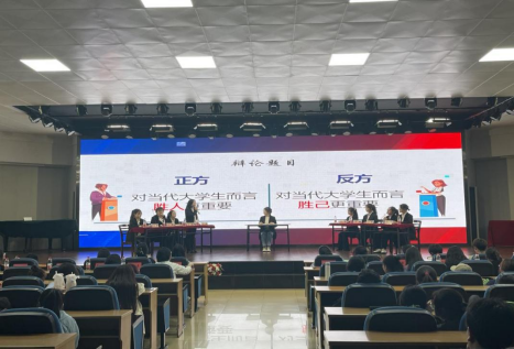 夫辩者,将以明是非之分,审治乱之纪,明同异之处,察明实之理。首先,介绍本次决赛的两个辩题,“对当代大学生而言,胜任更重要还是胜己更重要”和“当代孔乙己的长衫是否桎梏”。第一场辩论结束后,主持人与现场观众进行互动,由观众向正反双方进行提问,辩手进行回答。为丰富辩论赛的节目形式,本场活动也邀请到现代服务管理学院同学进行脱口秀表演。表演者以大学生为切入点并结合本次辩论赛的辩题观点,让大家得到放松的同时也展现出大学生面对困难与挫折的应对方法与真实写照。历时两个小时,最终正方赢得了本次比赛的胜利。颁奖嘉宾为获胜的队伍及双方的最佳辩手颁奖比赛,赛后进行合影留念。