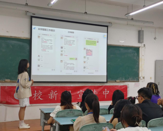随后,付蓉钰琦对校新闻宣传中心在本学期所获得的荣誉进行了补充。她表示,校新闻宣传中心能在微博造浪音乐节最具影响高校投票中荣获四川省第一名,在中国大学生在线2022年度中入选校园媒体百强等,每一项荣誉都离不开校新闻宣传中心每一位成员的努力。她对每一位部员的付出和老师的指导表示感谢,并希望大家总结经验,保持热爱,让学校宣传工作更上一个新台阶。
