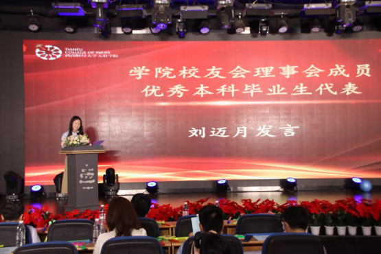 仪式最后,学院校友会理事会成员、优秀本科毕业生代表刘迈月发言。她说:“我很荣幸获得这份殊荣,同时倍感责任重大。我将不断提升自身的能力和素质,积极搭建校友之间的交流桥梁,关注学校和学院发展,为校友提供帮助、携手共进,提高可能性、创造新机会。”