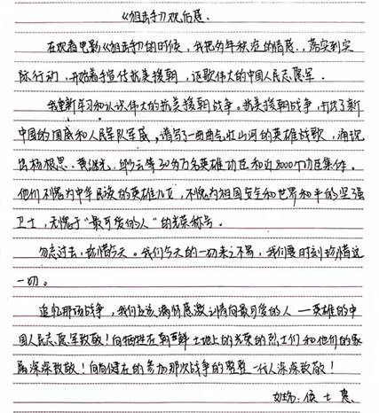 观影后,同学们纷纷发表了感言并书写了心得体会,如周聪梅同学讲道:“关于电影中不断出现且让我感触颇深的点是班长告诉战士‘不要哭’‘牺牲是不需要眼泪的’,在朝鲜的寒风暴雪中,我们的战士连哭都要忍着,眼泪是会冻住的,对于狙击手来说,这是不可以的。那样艰苦的条件下,那样年轻的生命,用他们的热血为我们铸成了钢铁长城,告诉世界一一我们这个民族是不可战胜的!”