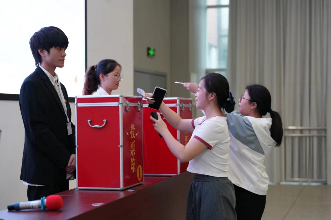 随后,主席团正式候选人代表向家乐、王国维、罗珊珊、詹雨洁、唐语欣、黄肜瑞六位同学进行竞选演讲。经过学生代表们的投票选举,最终产生新一届团总支、学生会主席团成员:向家乐、罗珊珊为执行主席、詹语洁,王国维、唐语欣和黄肜瑞为主席。提案环节中,学生代表们积极献言献策,从教学设施、学习生活等方面提出具有代表性和可行性的意见和建议。