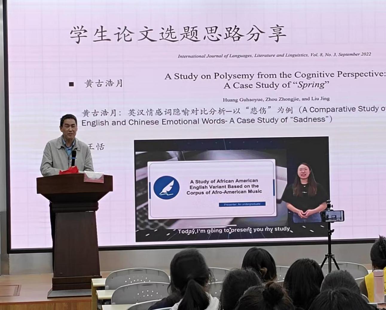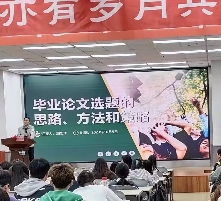 毕业论文作为课程体系的重要组成部分,选题是写论文的第一步,也是最关键的一步。为了提升同学们的论文写作能力,拓展其论文思维,文化与教育学院特邀请外语系主任周忠杰副教授于10月9日开展了“关于论文的若干思考”主题讲座活动。此次活动面向文化与教育学院全体学生,共有150人参加。
