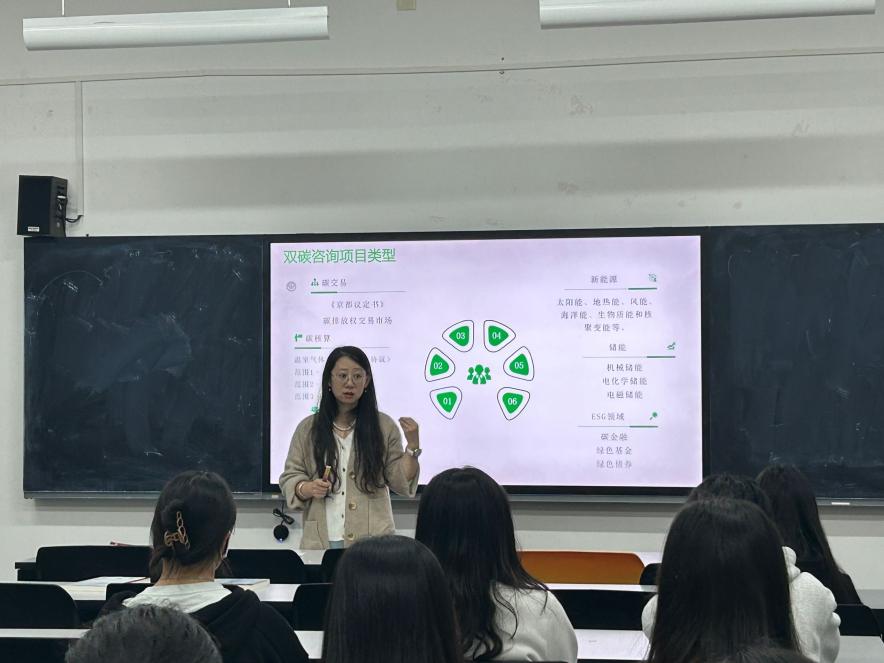 讲座主要分为三个部分:双碳目标带来的挑战和机会、咨询服务方案和会计学院的独特优势。讲座详细讲解了双碳的重要性以及达成双碳目标所带来的机遇和挑战,给低碳学习爱好师生们普及了关于低碳的基础知识,也让师生们对于低碳未来发展的方向和实践路径有了更加具象化的理解。