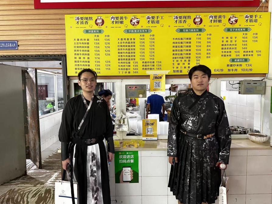 全院师生身着民族服饰进行日常学习和生活,在校园内你能看见“奇异姿势”打卡的“小书童”,在时代广场参与国际教育展的“带刀侍卫”,在食堂购买兰州拉面的“文人雅士”,在操场嬉戏玩耍的“大家闺秀”。