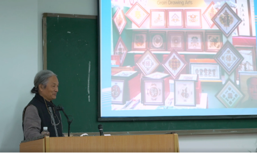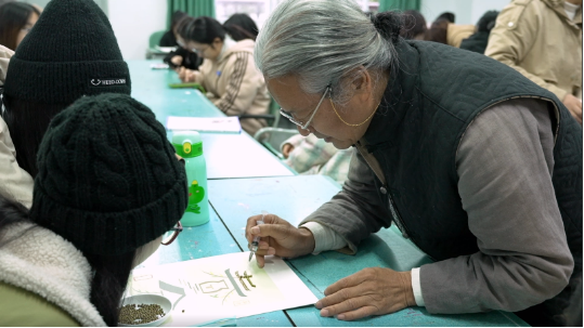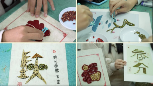 从如何分辨五谷杂粮、正确认识植物种子,到我国传承了五千年的农耕文化,潘德贵一步步激发起同学们的文化自信。潘德贵介绍道:“鑫田粮艺是用提前经过特殊处理的植物种子和五谷杂粮,在制好的模板上进行镶嵌、拼贴,完成图案、文字的传统技法,作品可进一步制成饰品、装饰画等,方便收藏和长久保存。”